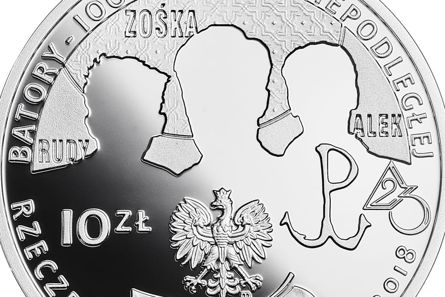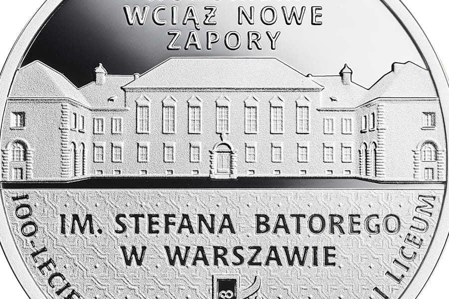 Gimnazjum im. Stefana Batorego w Warszawie powstało 1 września 1918 r. z myślą o odradzającej się Rzeczypospolitej. Cel szkoły zawarty został w słowach: „…aby kształcąca się w niej młodzież miała zawsze przed oczyma najwyższy wzór głębokiej myśli państwowej, władnego czynu oraz majestat Państwa Polskiego”. Zadanie to zostało wypełnione – Batory stał się symbolem wysokiego poziomu nauki oraz głębokiego poświęcenia w walce o wolność Ojczyzny. Dlatego tegoroczny jubileusz obchodzony jest pod hasłem „Batory – 100 lat dla Niepodległej”. To dla Niej tworzył i ginął Krzysztof Kamil Baczyński (matura 1939), dla Niej uczył się i umierał Jan Rodowicz „Anoda” (matura 1941), jeden z trzydziestu batoraków – kawalerów Virtuti Militari. Moneta podkreśla dwojaki wkład szkoły w dzieje Polski. Osiągnięcia naukowe absolwentów oraz znaczenie oświaty dla funkcjonowania nowoczesnego państwa symbolizują otwarta książka i fragment hymnu szkoły Pochodem idziemy (sł. Stanisław Młodożeniec, muz. Witold Lutosławski, matura 1931). Postaci bohaterów Kamieni na szaniec przypominają, że ponad trzystu batoraków zginęło na niemal wszystkich frontach II wojny światowej. Wielu z nich należało do 23 Warszawskiej Drużyny Harcerskiej, słynnej Pomarańczarni, do dziś nierozerwalnie związanej z Batorym. „Zośka”, „Rudy”, „Alek” (maturzyści 1939) nadal inspirują młodzież. „Alek” namalował w 1942 r. pierwsze kotwice Polski Walczącej. Można je obejrzeć na cokołach znajdujących się obecnie na terenie szkoły. Gmach Batorego nawiązuje wyglądem do architektury pałacowej przełomu XVI i XVII wieku. W tle rewersu monety został umieszczony wzór polichromii z reprezentacyjnej auli, której z okazji jubileuszu przywrócono przedwojenny wygląd. Wręczany każdemu absolwentowi znaczek z trzema zębami jest nawiązaniem do herbu rodziny Batorych. Marcin Miros