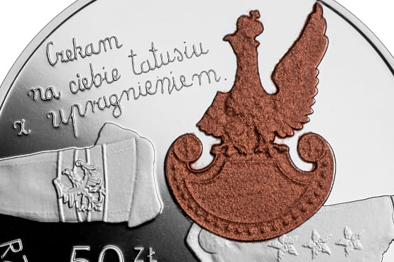 z prawej strony wizerunek orła Wojska Polskiego wzoru 1919, z ułamanym skrzydłem, wydobytego z dołów śmierci w Charkowie. Z lewej strony odwzorowany fragment korespondencji z kartki pocztowej wysłanej przez rodzinę do jednego z jeńców o treści: Czekam / na ciebie tatusiu / z upragnieniem, zakończony kropką. Z lewej i prawej strony naramienniki Policji Województwa Śląskiego i Wojska Polskiego. Poniżej naramiennika z lewej strony napis: 50 ZŁ. U dołu wizerunek orła ustalony dla godła Rzeczypospolitej Polskiej, pod orłem, po prawej stronie, znak mennicy: m / w; wzdłuż dolnego brzegu półkolem napis: RZECZPOSPOLITA POLSKA 2025.