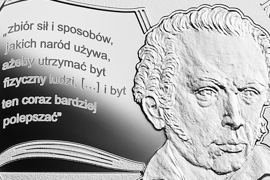 Fryderyk Florian Skarbek (1792–1866) to myśliciel o wszechstronnych dokonaniach, pamiętany przede wszystkim ze względu na prace naukowe z zakresu ekonomii. Niemniej jego bogaty dorobek twórczy obejmuje także powieści, dramaty, wiersze, przekłady, jak również dzieła historyczne i malarstwo pejzażowe. Pochodził ze starej szlacheckiej rodziny legitymującej się herbem Abdank. Jako młodzieniec kształcił się pod nadzorem Mikołaja Chopina, ojca Fryderyka. W liceum pobierał nauki u słynnego językoznawcy Samuela Bogumiła Lindego, któremu pomagał w pracach nad słownikiem języka polskiego. Następnie wyjechał na studia do Francji, by po dwóch latach wrócić do ojczyzny. Przez kilkanaście lat wykładał ekonomię polityczną na Uniwersytecie Warszawskim. W ciągu swojego życia polski uczony piastował wiele urzędów publicznych. Skarbek nadał nauce o gospodarowaniu rys narodowy, dlatego też nazywany jest ojcem polskiej ekonomii. W swoich dziełach uwypuklał pojęcie narodu, wiążąc w całość wszystkie zjawiska związane z gospodarką ogólnonarodową. Warunków rozwoju i dobrobytu społecznego upatrywał Skarbek w istnieniu szerokiej grupy średnich właścicieli. Z kolei w celu likwidacji ubóstwa chłopów i nędzy robotników najemnych postulował przekształcenie ich w rzeszę drobnych przedsiębiorców. Odrzucał pojęcie homo oeconomicus, podkreślając dążenia jednostki do osiągania nie tylko celów materialnych, lecz także duchowych i społecznych. Skarbek akcentował znaczenie własności prywatnej, która lepiej służy rozkwitowi społecznemu niż interwencjonizm państwowy i biurokracja. Postulował rozwój przemysłu, działania prowadzące do zmniejszenia długu publicznego i redukcję obciążeń fiskalnych. Uczony kładł nacisk na konieczność pozyskiwania kapitału poprzez prywatne oszczędności oraz zaznaczał nieodzowność równomiernego wzrostu wszystkich dziedzin gospodarki. Prowadził także działalność społeczną i dobroczynną – wspierał zakładanie kas oszczędnościowych dla robotników oraz budowę przytułków dla ludzi bezdomnych i ubogich. Wśród głównych dzieł polskiego ekonomisty warto wymienić jego opus magnum „Ogólne zasady nauki gospodarstwa narodowego”, dwutomowy podręcznik „Gospodarstwo narodowe”, pracę historyczną „Dzieje Księstwa Warszawskiego”, jak również powieść „Pamiętniki Seglasa”. Na awersie monety przedstawiona została otwarta księga, na której widnieje tytuł jednego z dzieł Fryderyka Skarbka: „Gospodarstwo narodowe”. Na rewersie znajduje się portret Fryderyka Skarbka, a po jego lewej stronie, na karcie księgi zapisano autorską definicję „gospodarstwa narodowego”. Poniżej znajdują się daty urodzin i śmierci Fryderyka Skarbka. Grzegorz Jeż